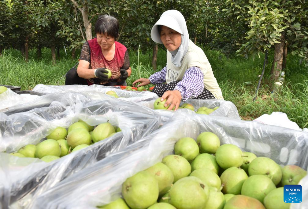 Farmers sort out freshly picked pears at an orchard in Zhangying Township, Weixian County, north China's Hebei Province, July 27, 2023. Pears, a specialty produce and leading bread earner for many farmers in Weixian, are growing in over 100,000 mu (about 6,666.67 hectares) of arable lands in Weixian, with an annual output of more than 130,000 tonnes. (Xinhua/Zhu Xudong)