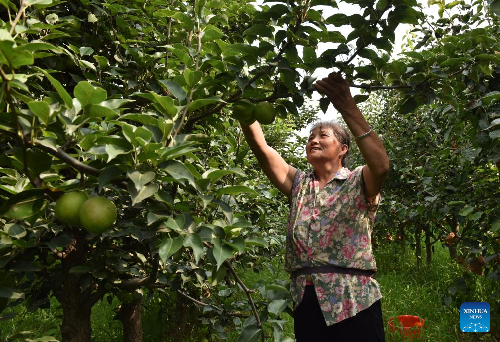 A farmer picks pears at an orchard in Zhangying Township, Weixian County, north China's Hebei Province, July 27, 2023. Pears, a specialty produce and leading bread earner for many farmers in Weixian, are growing in over 100,000 mu (about 6,666.67 hectares) of arable lands in Weixian, with an annual output of more than 130,000 tonnes. (Xinhua/Zhu Xudong)