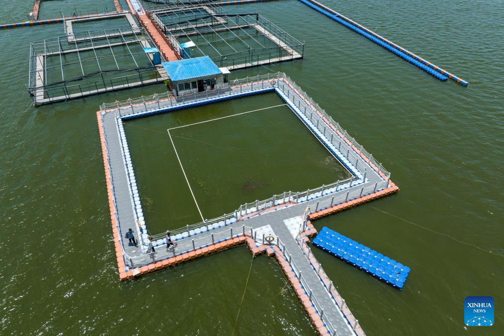 Staff members from the Institute of Hydrobiology, the Chinese Academy of Sciences monitor the Yangtze finless porpoises growing in a cage at the Yangtze River Swan Island Baiji Dolphin National Nature Reserve, central China's Hubei Province, June 27, 2023. (Xinhua/Wu Zhizun)