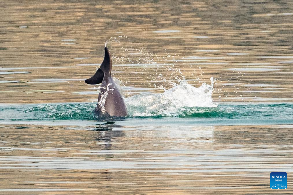 A Yangtze finless porpoise hunts for food in the section of Yangtze River in Yichang City, central China's Hubei Province, Feb. 19, 2023. (Xinhua/Xiao Yijiu)