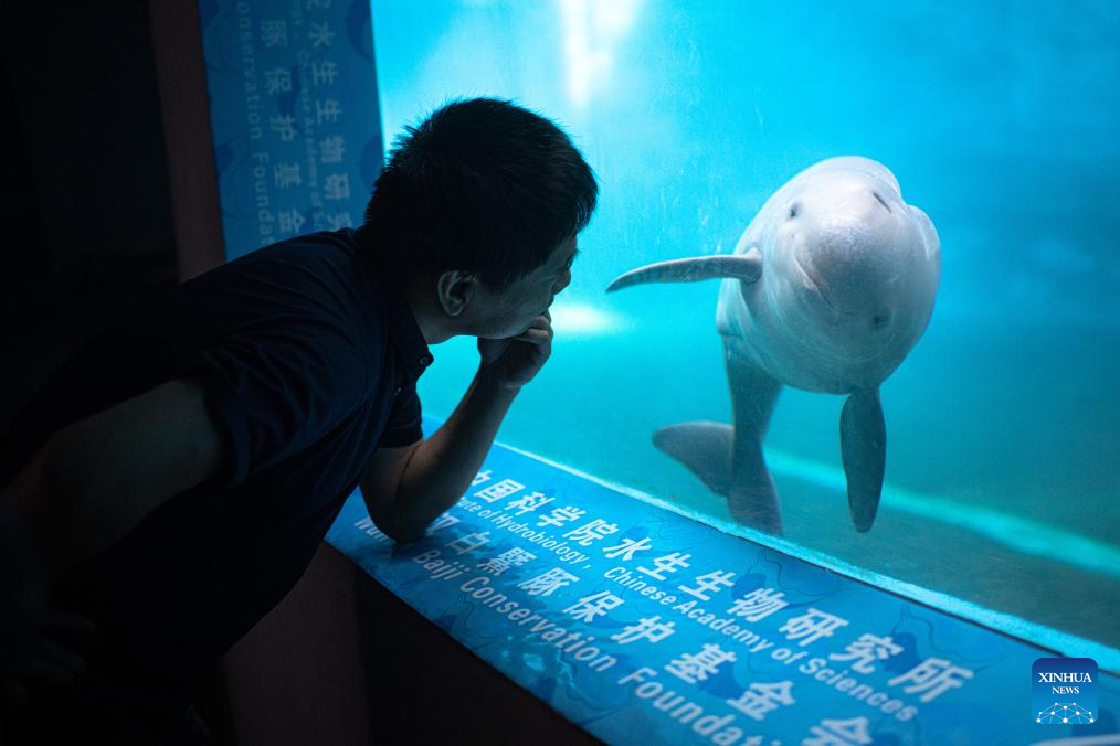 Hao Yujiang, an associate researcher of the the Institute of Hydrobiology, the Chinese Academy of Sciences (CAS), observes a Yangtze finless porpoise at the Baiji Dolphin House under his institute in Wuhan, central China's Hubei Province, on July 12, 2023. (Xinhua/Wang Yijie)