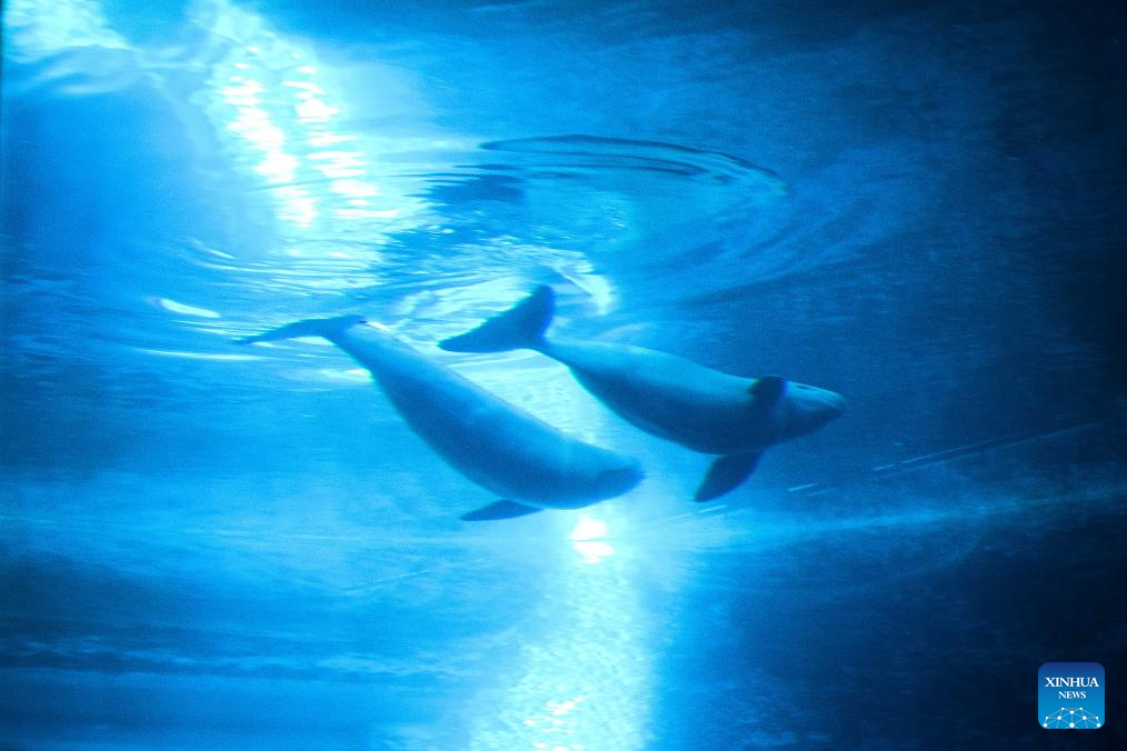 Two Yangtze finless porpoises swim at the Baiji Dolphin House under the Institute of Hydrobiology, the Chinese Academy of Sciences (CAS) in Wuhan, central China's Hubei Province, on July 12, 2023. (Xinhua/Xiao Yijiu)