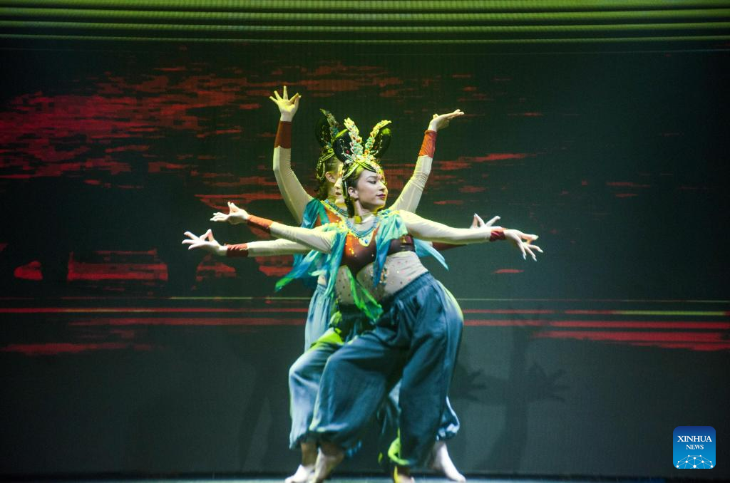Dancers of China's Xinjiang Art Theater Muqam Art Troupe perform in Bandung, Indonesia, July 27, 2023. The art troupe presented its first performance in Jakarta, capital of Indonesia, on July 19, and will travel to other cities until August 10. (Photo by Septianjar Muharam/Xinhua)