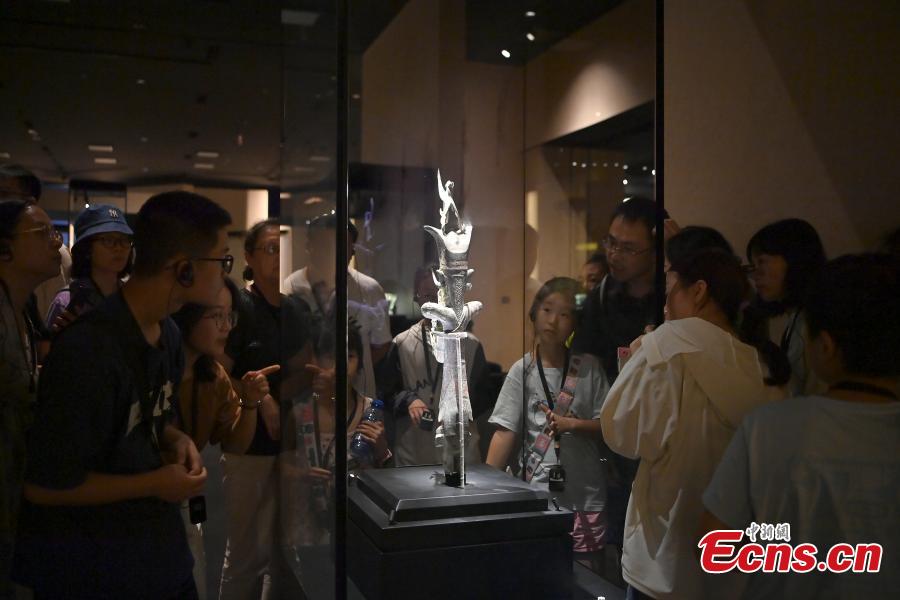 Visitors view cultural relics exhibited at the new building of the Sanxingdui Museum in Guanghan, southwest China's Sichuan Province, July 27, 2023. (Photo: China News Service/An Yuan)
