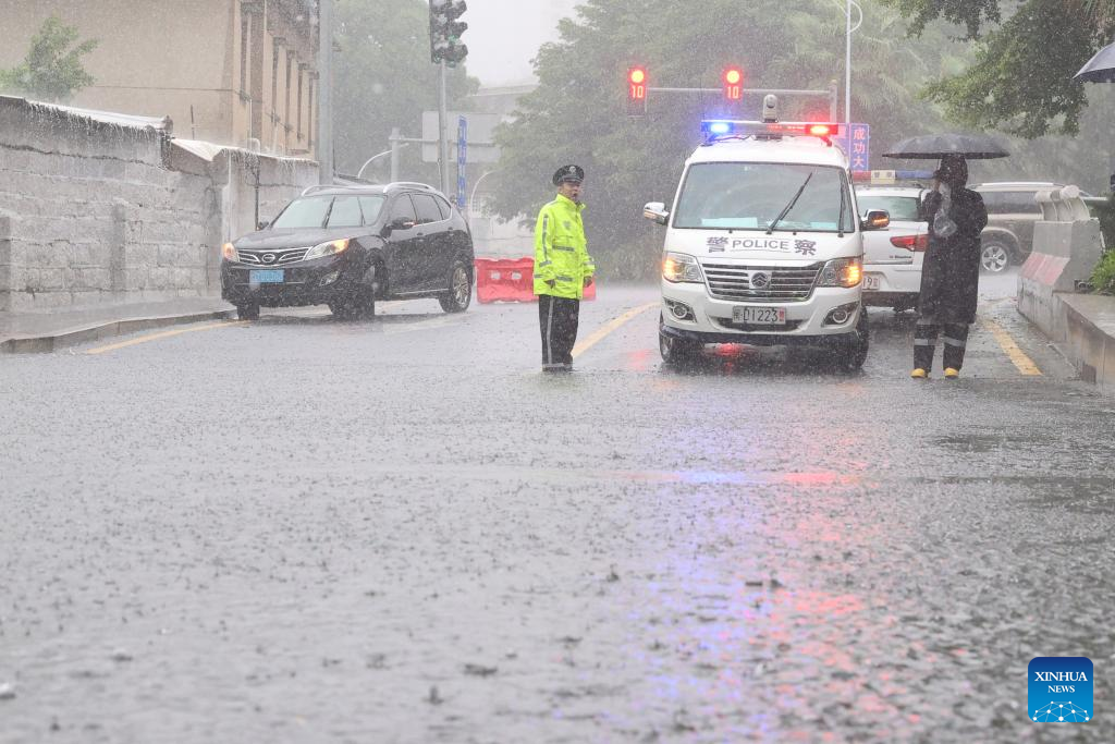 Police officers are on duty on a waterlogged road in Siming District of Xiamen, southeast China's Fujian Province, July 28, 2023. Typhoon Doksuri, the fifth typhoon of this year, made landfall in east China's Fujian Province on Friday morning, bringing with it powerful winds and heavy rain. (Photo by Zeng Demeng/Xinhua)