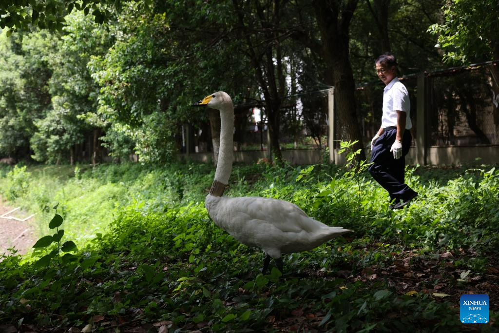 A staff member watches a swan in a protection station of the Poyang Lake National Nature Reserve in Yongxiu County, east China's Jiangxi Province, July 15, 2023. Staff members composed of rescuers, doctors, patrolmen and police officers in the protection station of Poyang Lake National Nature Reserve and the Wildlife Rescue and Breeding Center of Jiangxi Province rescue injured migratory birds and help them return to the wild. (Xinhua/Jin Liwang)