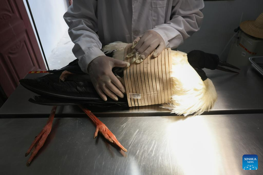 A staff member checks the condition of an oriental white stork in the Wildlife Rescue and Breeding Center of Jiangxi Province in Nanchang, east China's Jiangxi Province, July 16, 2023. Staff members composed of rescuers, doctors, patrolmen and police officers in the protection station of Poyang Lake National Nature Reserve and the Wildlife Rescue and Breeding Center of Jiangxi Province rescue injured migratory birds and help them return to the wild. (Xinhua/Jin Liwang)