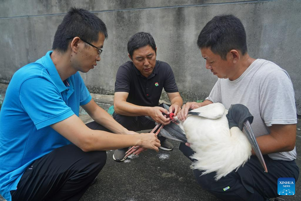 Staff members put a GPS tracker on an oriental white stork that was about to be released in the Wildlife Rescue and Breeding Center of Jiangxi Province in Nanchang, east China's Jiangxi Province, July 20, 2023. Staff members composed of rescuers, doctors, patrolmen and police officers in the protection station of Poyang Lake National Nature Reserve and the Wildlife Rescue and Breeding Center of Jiangxi Province rescue injured migratory birds and help them return to the wild. (Xinhua/Wan Xiang)