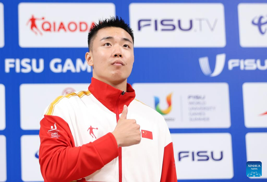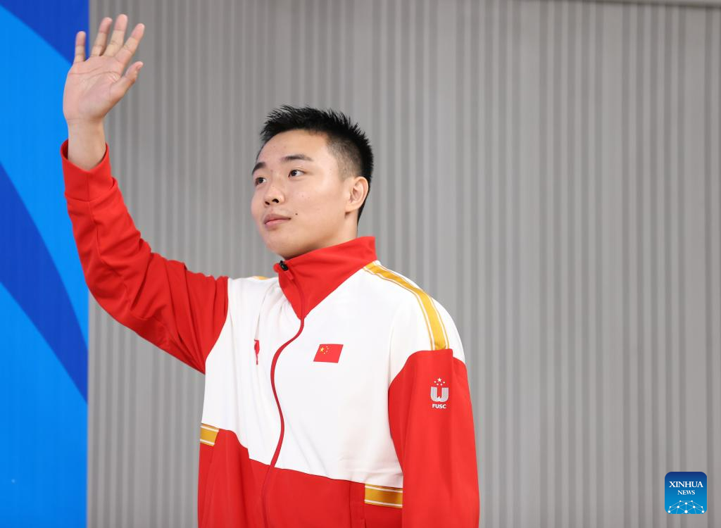 Cao Maoyuan of China reacts during the medal ceremony for the Wushu Men's Nanquan at the 31st FISU Summer World University Games in Chengdu, southwest China's Sichuan Province, July 29, 2023. (Xinhua/Jia Haocheng)