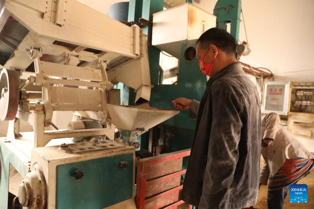 Workers process rice at the China-Mozambique Agricultural Technology Demonstration Center in Boane district of Maputo Province, Mozambique, July 25, 2023. Built in 2010, the demonstration center is an important cooperation project between the Chinese and Mozambican governments. Apart from doing agricultural experiments, the center is also involved in the training of local farmers. (Xinhua/Dong Jianghui)