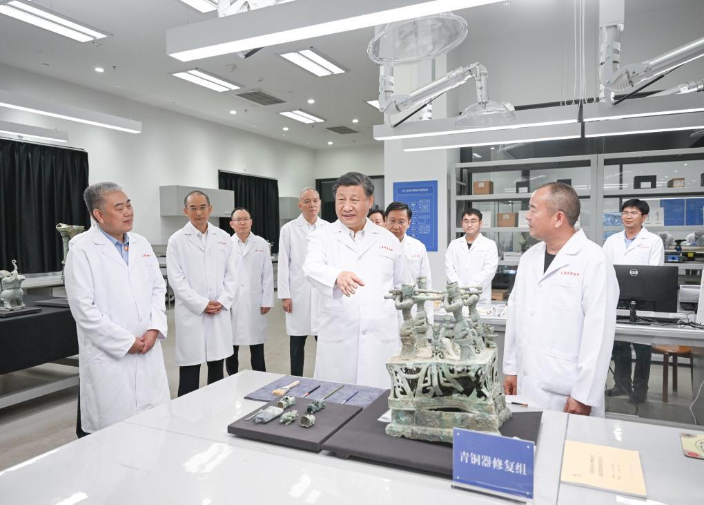After touring the exhibition halls, Xi went to the venue for relic preservation and repair, where he carefully observed the procedures, details, and latest techniques. Xi also talked with the staff on site.