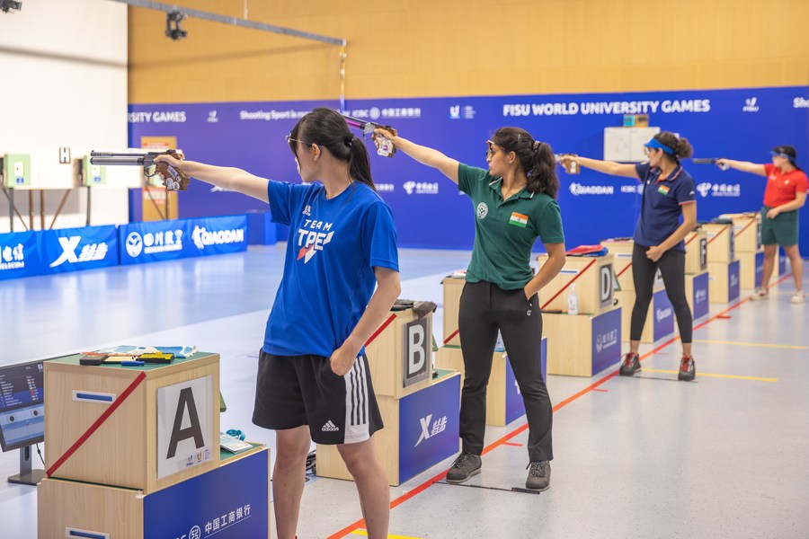 Athletes compete in the women's 10m air pistol team event at the 31st FISU World University Games in Chengdu, southwest China's Sichuan Province, July 29, 2023. (Xinhua/Huang Wei)