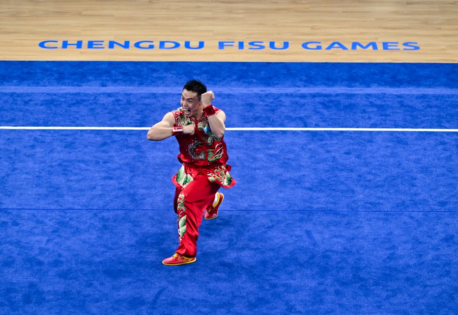 Cao Maoyuan of China competes in the Wushu men's Nanquan at the 31st FISU World University Games in Chengdu, southwest China's Sichuan Province, July 29, 2023. (Xinhua/Wang Xi)