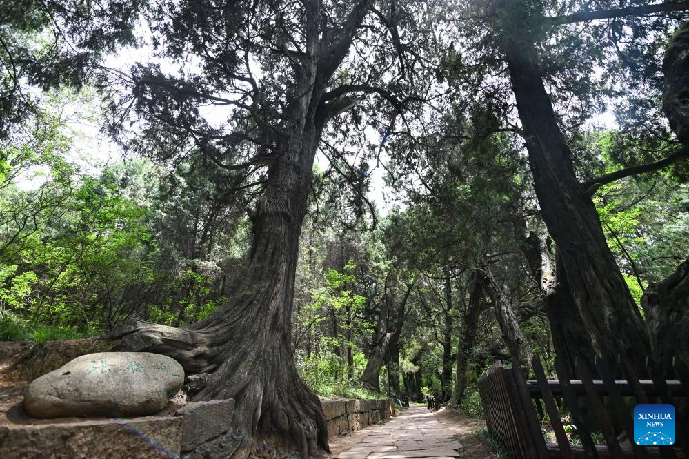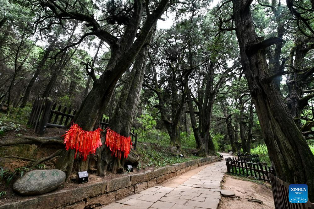 This photo taken on July 24, 2023 shows ancient cypress trees in the Cuiyunlang section of an ancient road system known as "Shudao" in Jiange County of Guangyuan City, southwest China's Sichuan Province. (Xinhua/Wang Xi)
