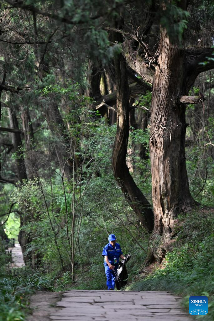 A cleaner picks up fallen leaves and branches in the Cuiyunlang section of an ancient road system known as "Shudao" in Jiange County of Guangyuan City, southwest China's Sichuan Province, July 25, 2023. (Xinhua/Liu Kun)