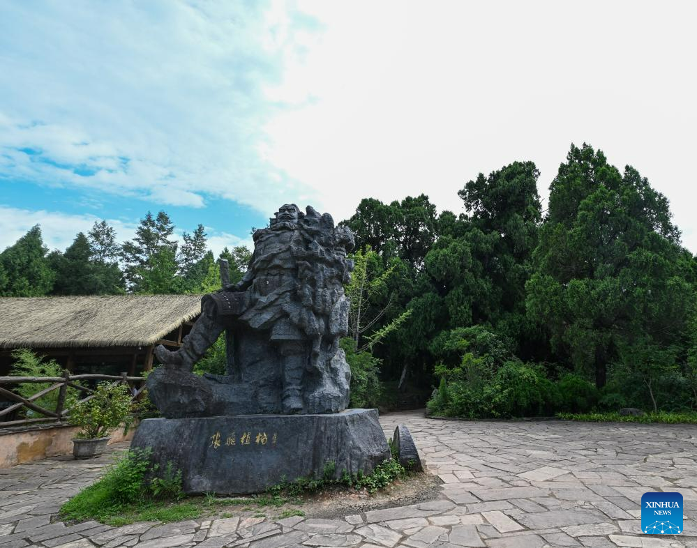 This photo taken on July 24, 2023 shows a statue with a theme of ancient cypress trees in the Cuiyunlang section of an ancient road system known as "Shudao" in Jiange County of Guangyuan City, southwest China's Sichuan Province. (Xinhua/Wang Xi)