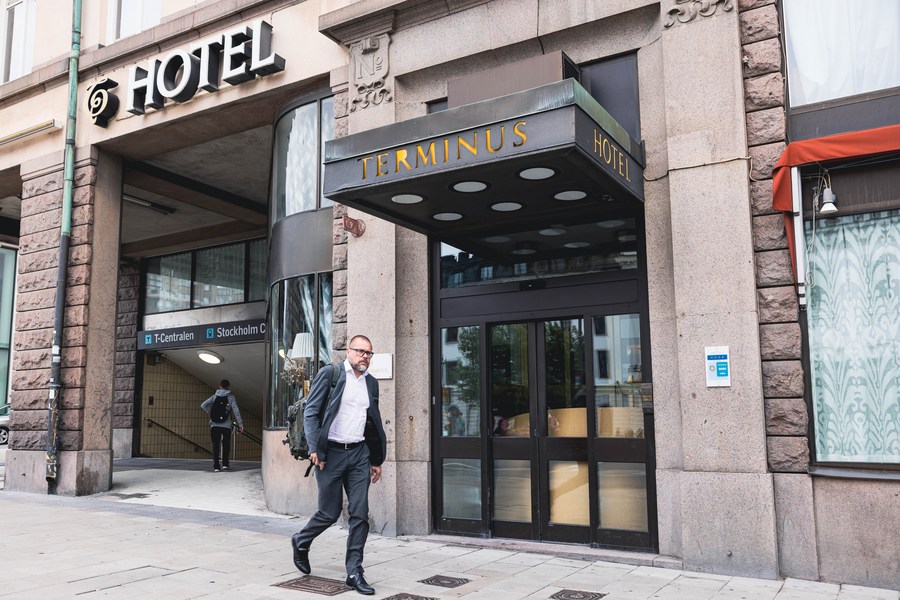 A man walks past a hotel in Stockholm, capital of Sweden, July 26, 2023. (Photo by Wei Xuechao/Xinhua)