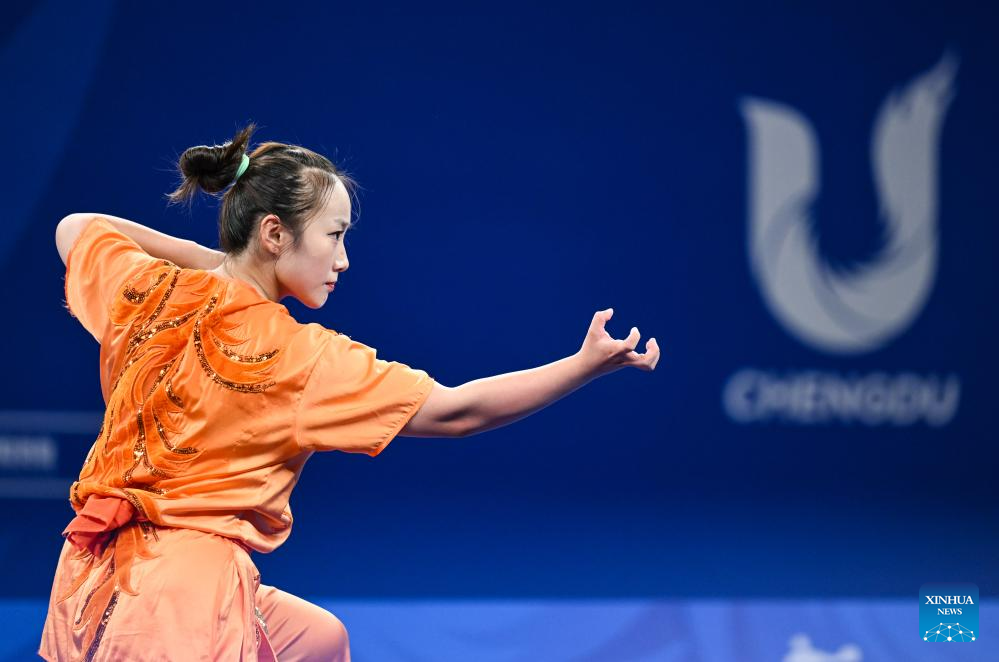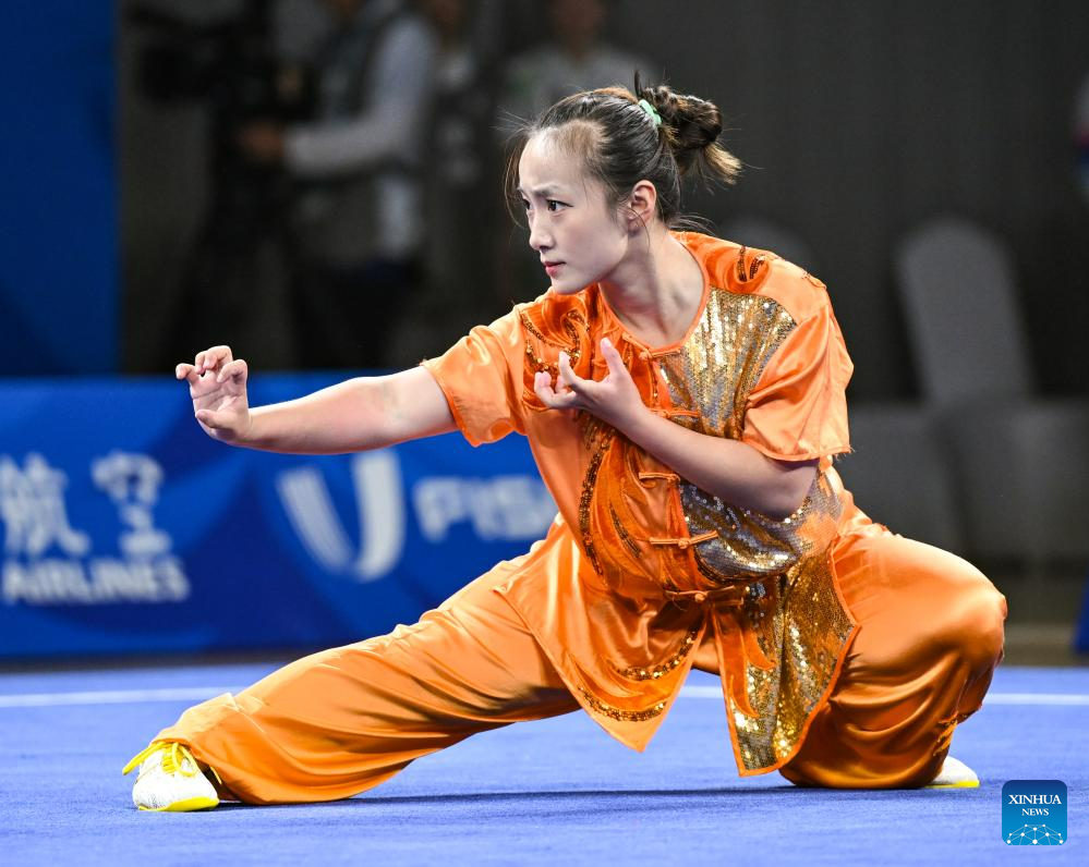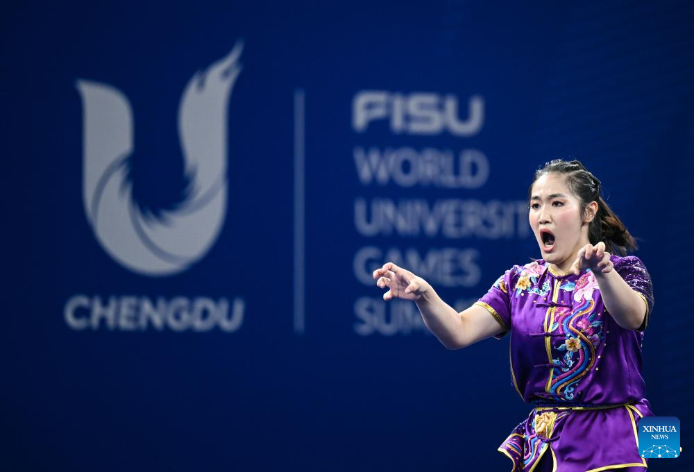 Song Cuifang of China competes during the Wushu women's Nanquan at the 31st FISU Summer World University Games in Chengdu, southwest China's Sichuan Province, July 30, 2023. (Xinhua/Wang Xi)