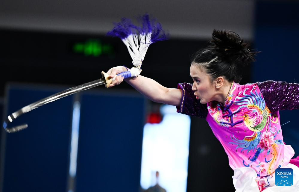 Nandhira Mauriskha of Indonesia competes during the Wushu Women's Jianshu at the 31st FISU Summer World University Games in Chengdu, southwest China's Sichuan Province, July 30, 2023. (Xinhua/Wang Xi)