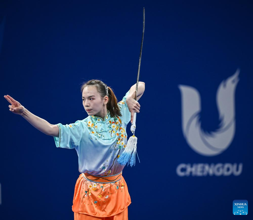 Wong Weng Ian of China's Macau competes during the Wushu Women's Jianshu at the 31st FISU Summer World University Games in Chengdu, southwest China's Sichuan Province, July 30, 2023. (Xinhua/Wang Xi)