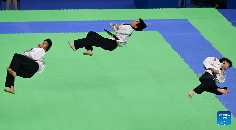 Hu Mingda (C), Yang Lei (R) and Liu Siyue of China compete during the final of men's Team Poomsae of Taekwondo at the 31st FISU Summer World University Games in Chengdu, southwest China's Sichuan Province, July 30, 2023. (Xinhua/Liu Lei)