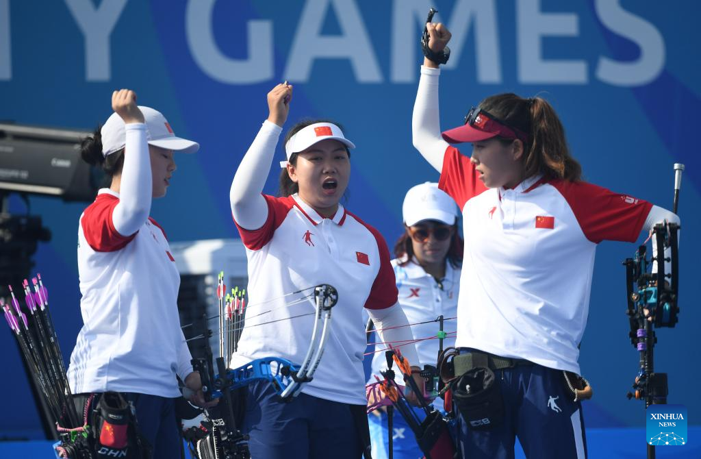 Ma Shujia, Zhou Jiayu and Wang Yuanyuan (L to R) of China cheer during the Archery Compound Women's Team Bronze Medal Match between China and Chinese Taipei at the 31st FISU Summer World University Games in Chengdu, southwest China's Sichuan Province, July 30, 2023. (Xinhua/Deng Hua)