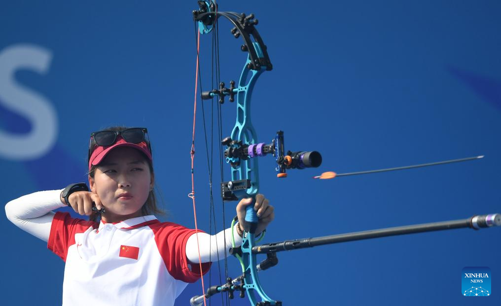 Wang Yuanyuan of China competes during the Archery Compound Women's Team Bronze Medal Match between China and Chinese Taipei at the 31st FISU Summer World University Games in Chengdu, southwest China's Sichuan Province, July 30, 2023. (Xinhua/Deng Hua)