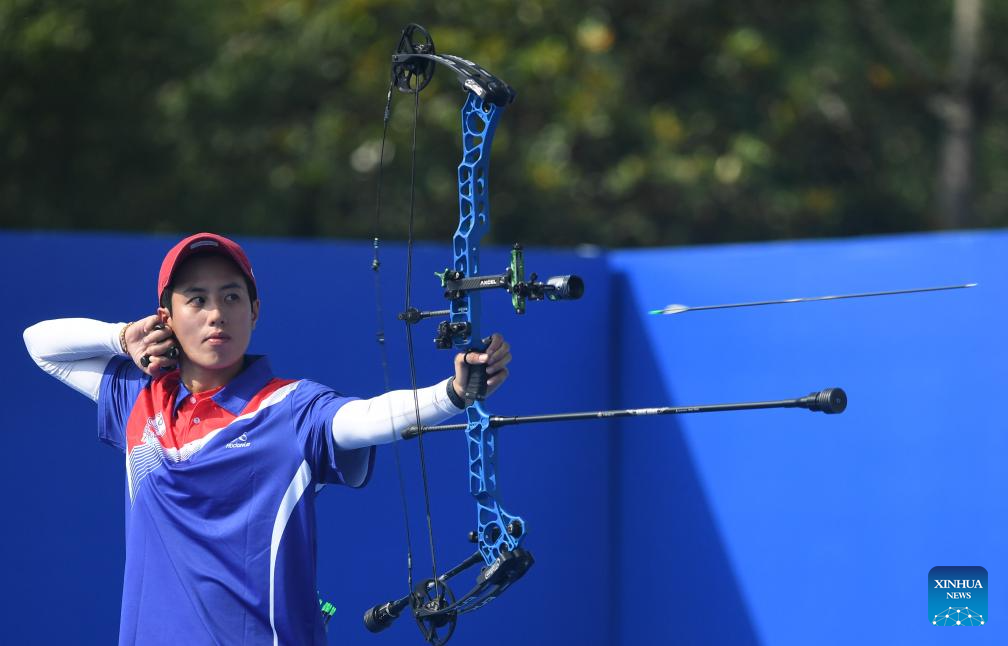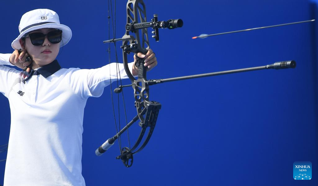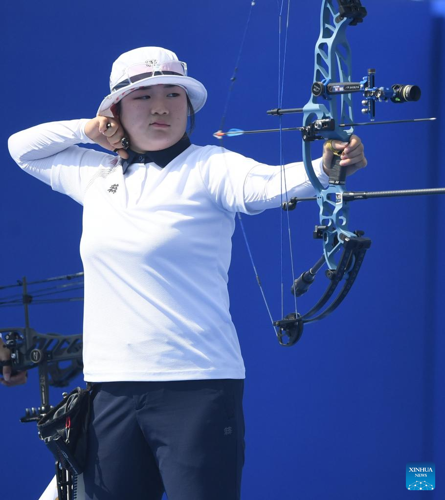 Han Seungyeon of South Korea competes during the Archery Compound Women's Team Gold Medal Match between South Korea and India at the 31st FISU Summer World University Games in Chengdu, southwest China's Sichuan Province, July 30, 2023. (Xinhua/Deng Hua)