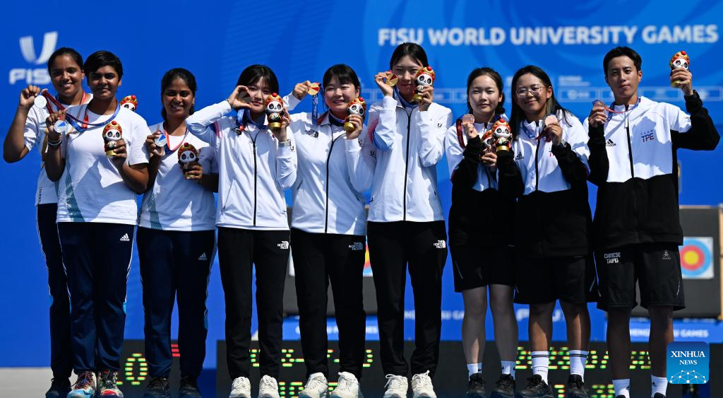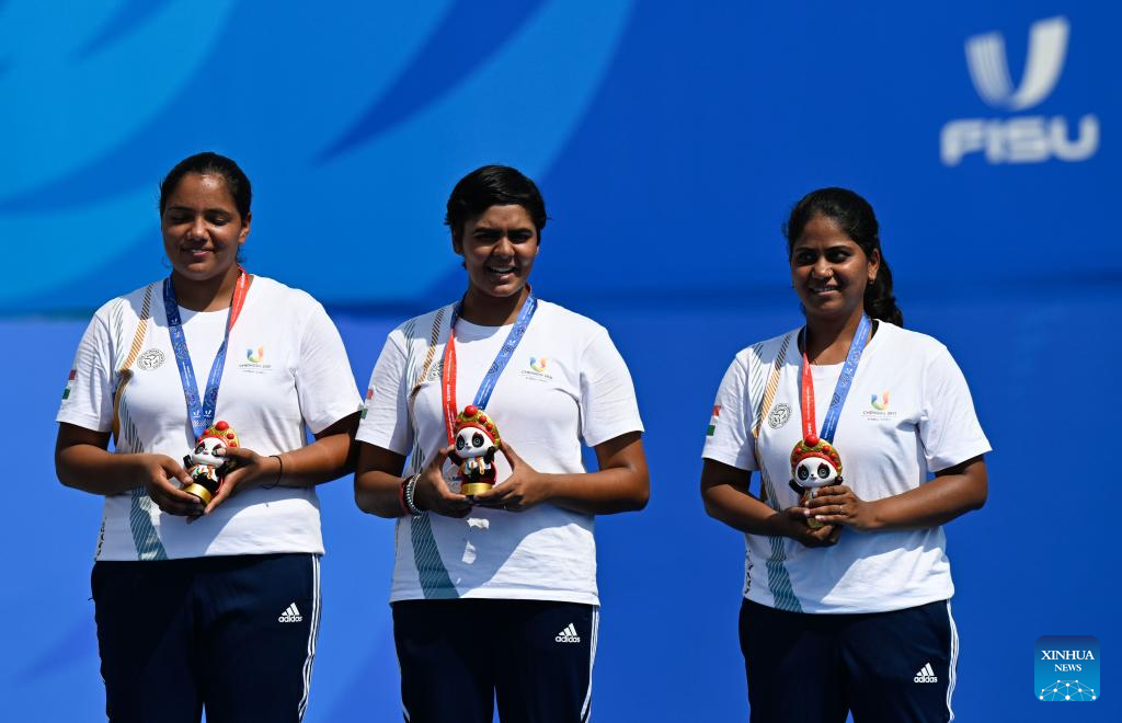 Team India attend the awarding ceremony after the Archery Compound Women's Team Gold Medal Match between South Korea and India at the 31st FISU Summer World University Games in Chengdu, southwest China's Sichuan Province, July 30, 2023. (Xinhua/Deng Hua)