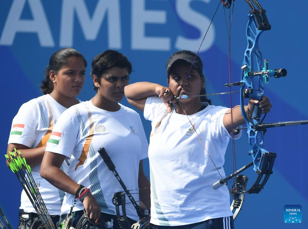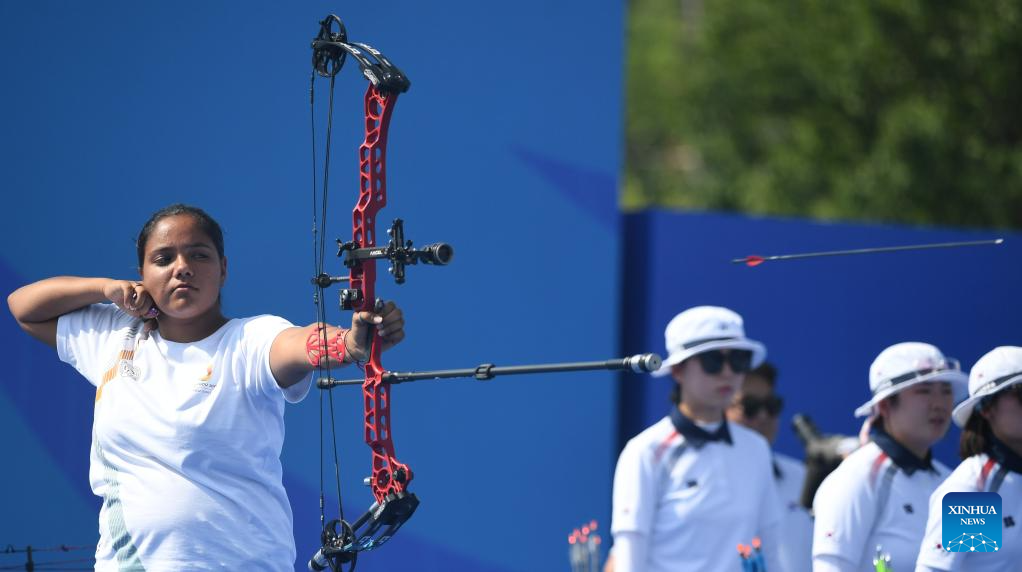 Avneet kaur of India competes during the Archery Compound Women's Team Gold Medal Match between South Korea and India at the 31st FISU Summer World University Games in Chengdu, southwest China's Sichuan Province, July 30, 2023. (Xinhua/Deng Hua)