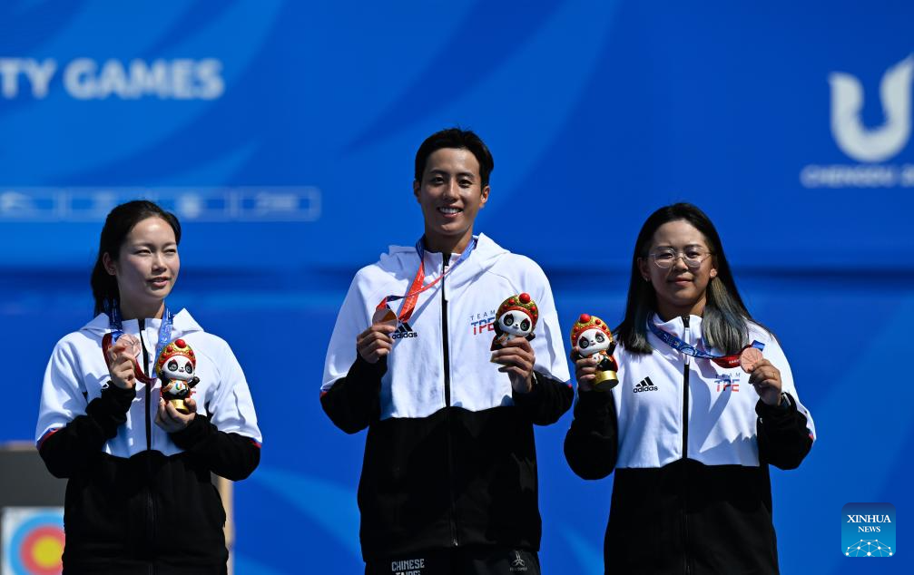Bronze medalists Hsu Yen-hua, Lin Ming-ching and Lo Yi-hsuan (L to R) of Chinese Taipei react during the medal ceremony for the Archery Compound Women's Team event at the 31st FISU Summer World University Games in Chengdu, southwest China's Sichuan Province, July 30, 2023. (Xinhua/Deng Hua)