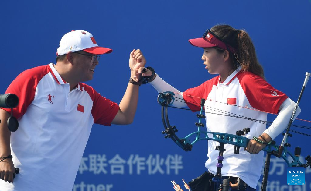 Wang Yuanyuan (R) of China reacts with her coach during the Archery Compound Women's Team Bronze Medal Match between China and Chinese Taipei at the 31st FISU Summer World University Games in Chengdu, southwest China's Sichuan Province, July 30, 2023. (Xinhua/Deng Hua)
