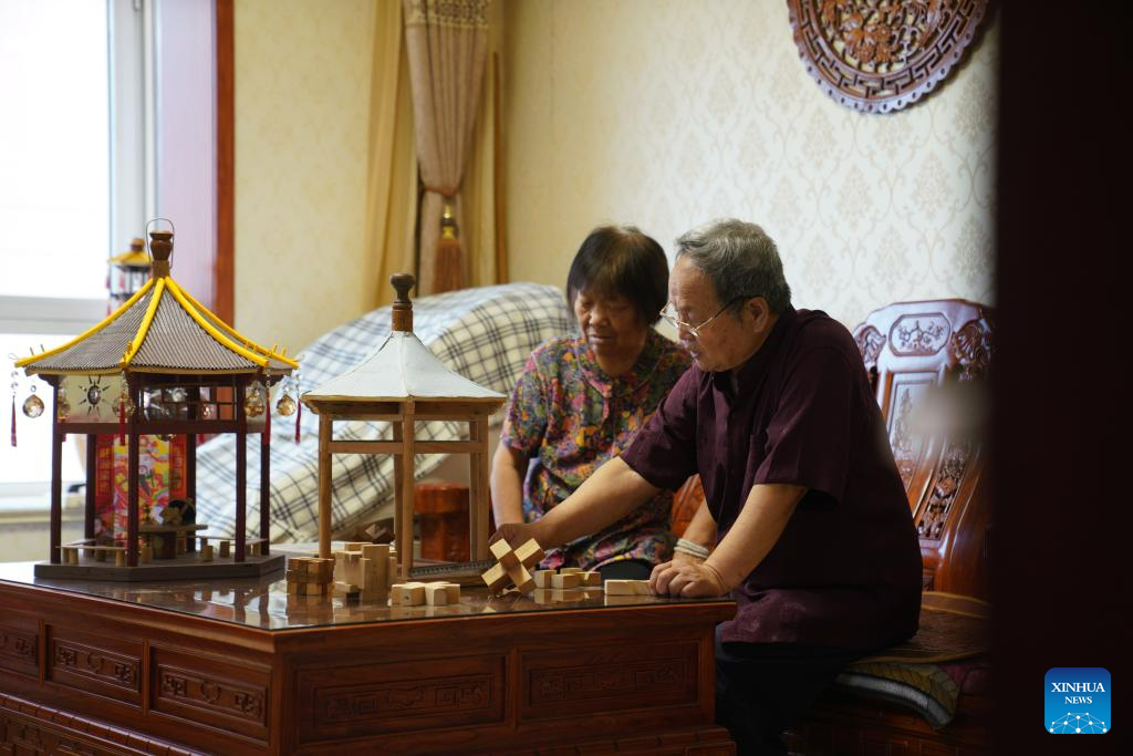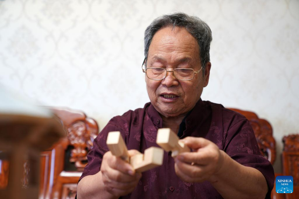 Craftsman Hou Quanchen shows how to reassemble a Kong Ming Lock at home in Shahe City, north China's Hebei Province, July 30, 2023. (Xinhua/Mu Yu)