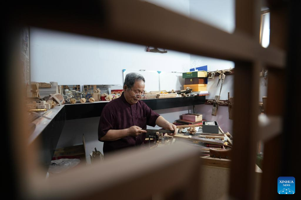Craftsman Hou Quanchen makes a Kong Ming Lock at a workshop in Shahe City, north China's Hebei Province, July 30, 2023.?(Xinhua/Mu Yu)