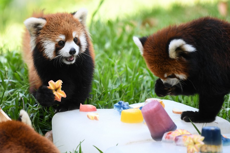Red pandas enjoy iced fruits at the Guangzhou Zoo in Guangzhou, south China's Guangdong Province, July 13, 2023. The zoo has taken various measures to cool the animals during the summer heat in Guangzhou. (Xinhua/Deng Hua)