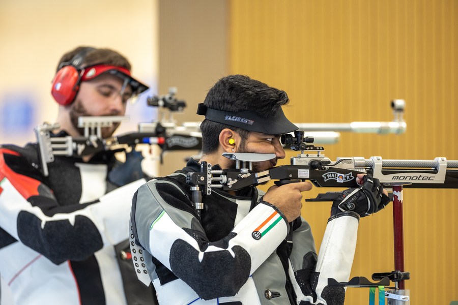 Aishwary Pratap Singh Tomar (R) of India competes in the men's 10m air rifle team final at the 31st FISU Summer World University Games in Chengdu, southwest China's Sichuan Province, July 31, 2023. (Xinhua/Huang Wei)