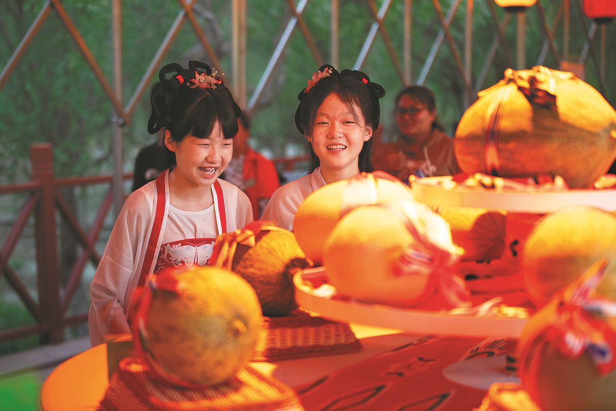 Two young visitors, wearing traditional Chinese garments, watch hami melons on display during a hami melon festival in Hami, Xinjiang Uygur autonomous region, on July 19. [Photo/China Daily]