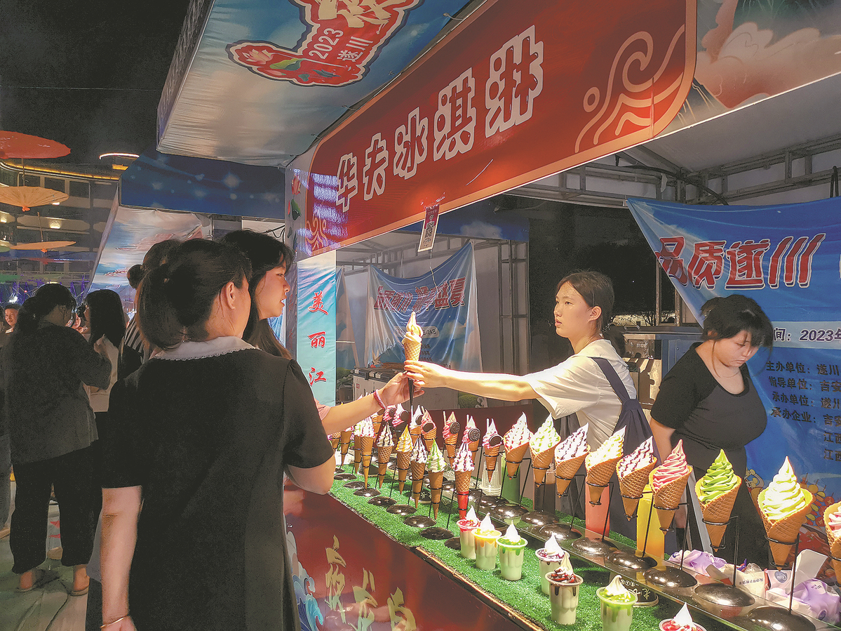 A visitor buys an ice cream cone at a booth during a night fair in Ji'an, Jiangxi province, on July 19. [XIAO YUANPAN/FOR CHINA DAILY]