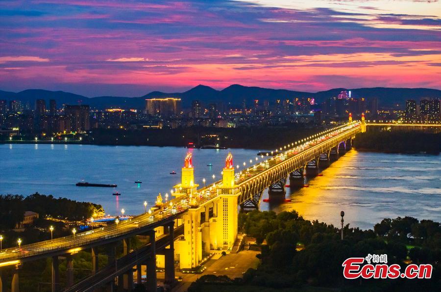 The Yangtze River Bridge is lit up at night in Nanjing, east China's Jiangsu Province, July 30, 2023. (Photo: China News Service/Yang Bo)