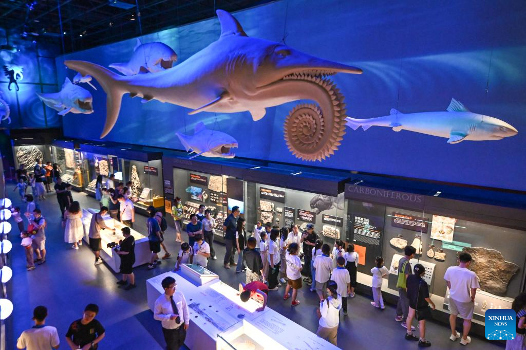 Students visit the National Maritime Museum of China in Tianjin, north China, July 29, 2023. During the summer vacation, the National Maritime Museum of China and the Tianjin Digital Art Museum jointly offered students with a study camp themed on ocean and art. Altogether 22 students from Beijing, Tianjin and Hebei Province learnt knowledge of ocean and nature and got in touch with digital art during the camp. (Xinhua/Sun Fanyue)