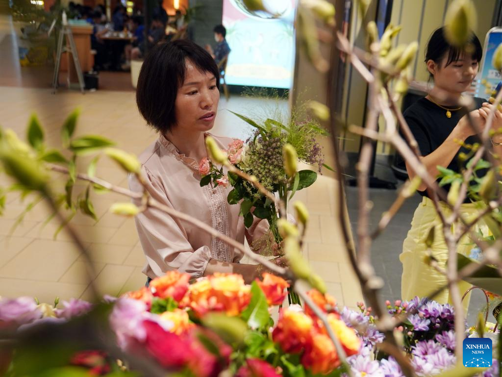 Zhu Chunnan selects fresh cut flowers for her employer's family at a store in east China's Shanghai, July 28, 2023. (Xinhua/Liu Ying)