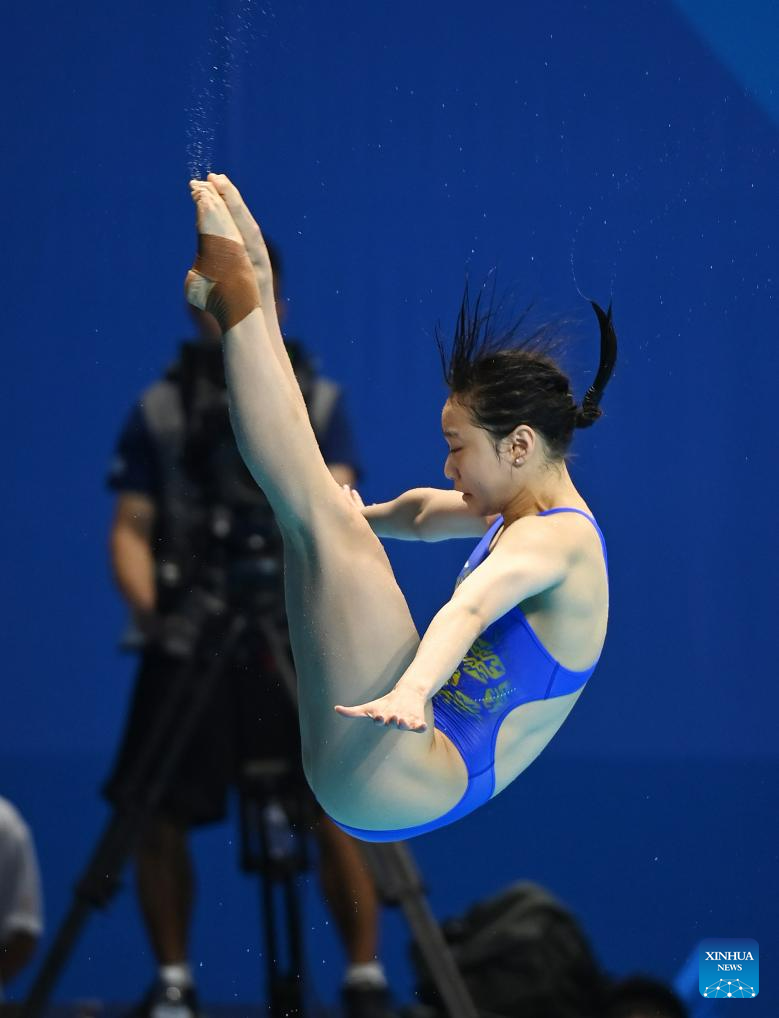 Chen Jia of China competes during the diving women's 1m springboard final at the 31st FISU Summer World University Games in Chengdu, southwest China's Sichuan Province, Aug. 1, 2023. (Xinhua/Liu Kun)