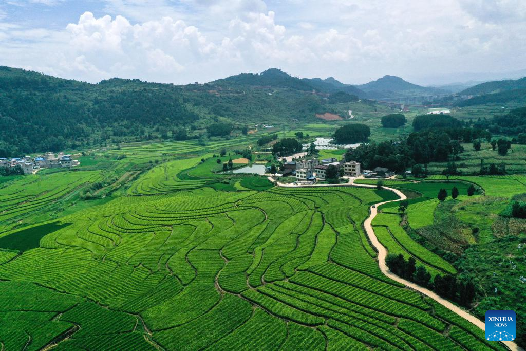 This aerial photo taken on Aug. 1, 2023 shows the hybrid rice planting base in Xinchang Village of Cengong County in southwest China's Guizhou Province. Cengong is a major rice-growing county in China with an annual yield of over 8 million kilograms of certified seeds. (Xinhua/Yang Wenbin)