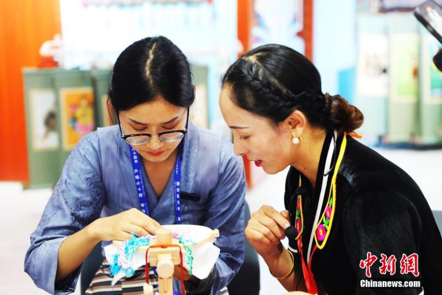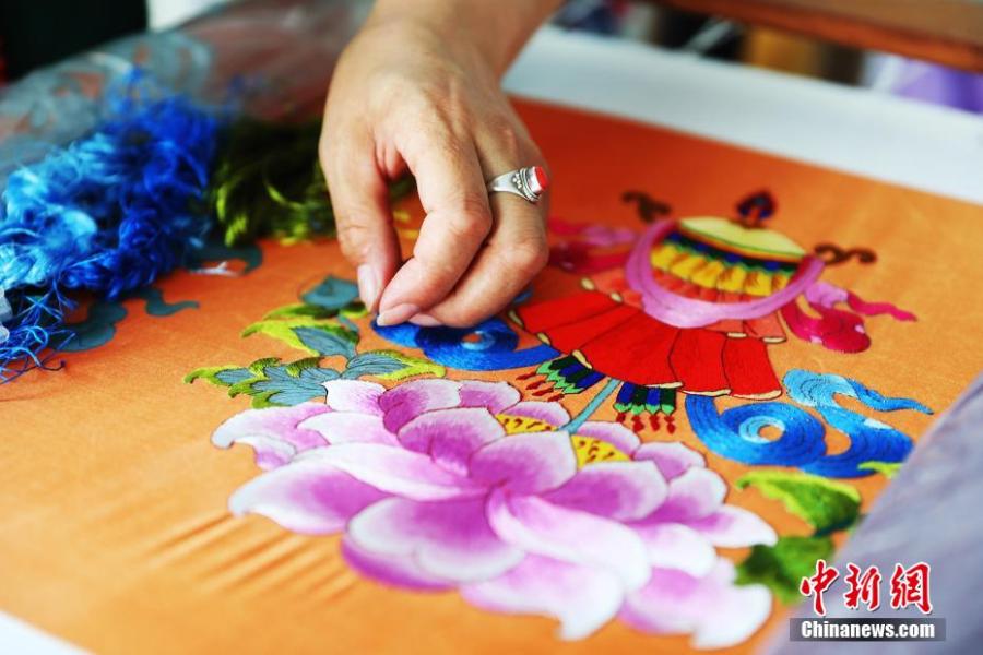 A visitor tries the Tibetan embroidery at a workshop in Hainan Tibetan Autonomous Prefecture, southeastern Qinghai Province, Aug. 1, 2023. (Photo: China News Service/Xue Di)