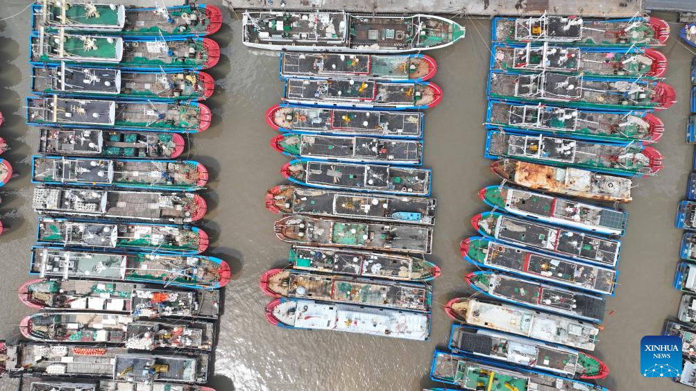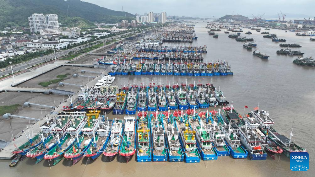This aerial photo taken on Aug. 1, 2023 shows fishing boats taking shelter from the approaching Typhoon Khanun at Shenjiamen port in Putuo District of Zhoushan, east China's Zhejiang Province. The summer fishing ban, which was scheduled to end at noon of Aug.1, is extended as a precaution against Typhoon Khanun. (Photo by Chen Yongjian/Xinhua)