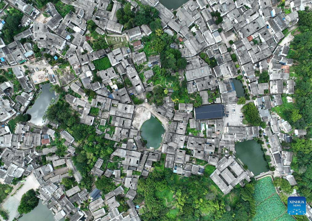 This aerial photo taken on Aug. 1, 2023 shows a pond in the shape of Eight Diagrams at the Zhuge Village of Lanxi City, east China's Zhejiang Province. The Zhuge Village, a historic gem with over 300 ancient buildings dating back to Ming and Qing dynasties (1368-1911), is home to descendents of Zhuge Liang, a renowned military strategist in the Three Kingdom Period (220-280). The village has made concerted efforts to preserve the ancient heritages and develop tourism, receiving over 500,000 visitors annually. (Xinhua/Weng Xinyang)