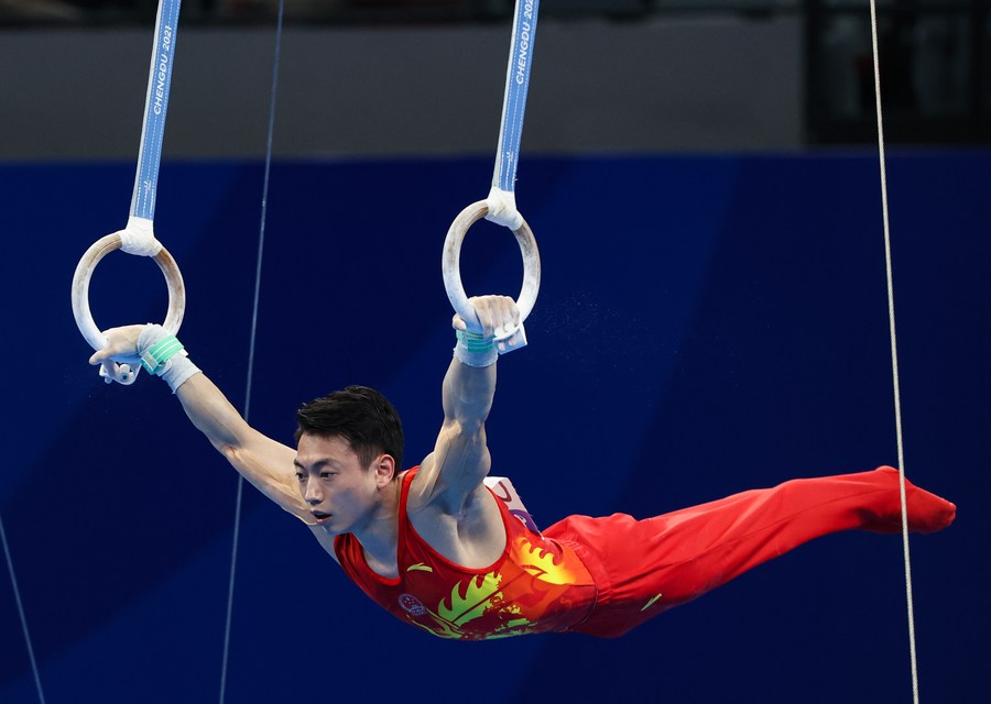 Zou Jingyuan of China competes in the rings during the artistic gymnastics men's team final at the 31st FISU Summer World University Games in Chengdu, southwest China's Sichuan Province, Aug. 2, 2023. (Xinhua/Wang Jingqiang)