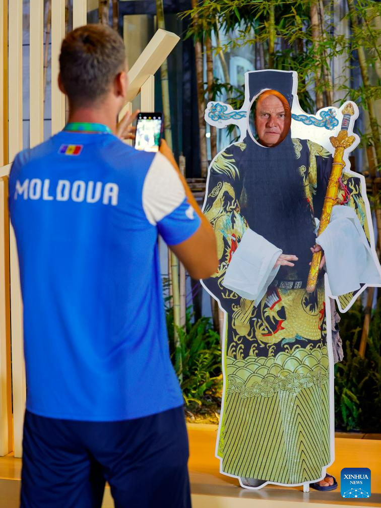 Members of Moldovian deligation take photo with a cardboard painted with the image of Peking Opera character at the Village of the 31st FISU Summer World University Games in Chengdu, southwest China's Sichuan Province, July 31, 2023. (Xinhua/Shen Bohan)