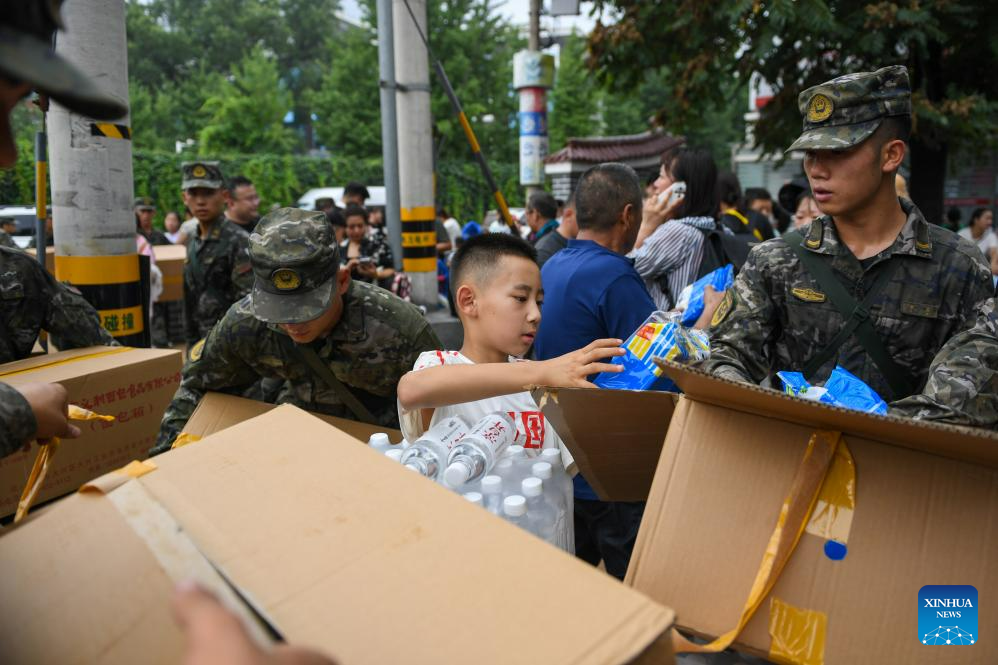 Soldiers distribute food and water to passengers of Train K396 in Miaofengshan Town of Mentougou District, Beijing, capital of China, Aug. 2, 2023. Train passengers trapped in Mentougou District due to heavy rainfall have been safely transferred on Wednesday. (Xinhua/Ju Huanzong)
