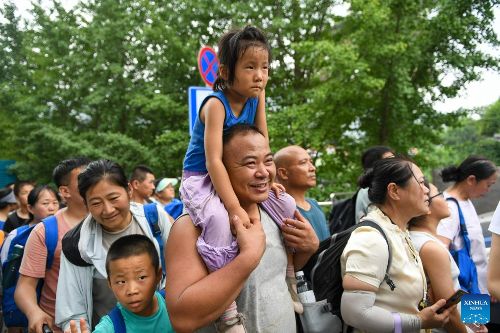 Passengers line up to get on a transshipment vehicle in Miaofengshan Town of Mentougou District, Beijing, capital of China, Aug. 2, 2023. Train passengers trapped in Mentougou District due to heavy rainfall have been safely transferred on Wednesday. (Xinhua/Ju Huanzong)